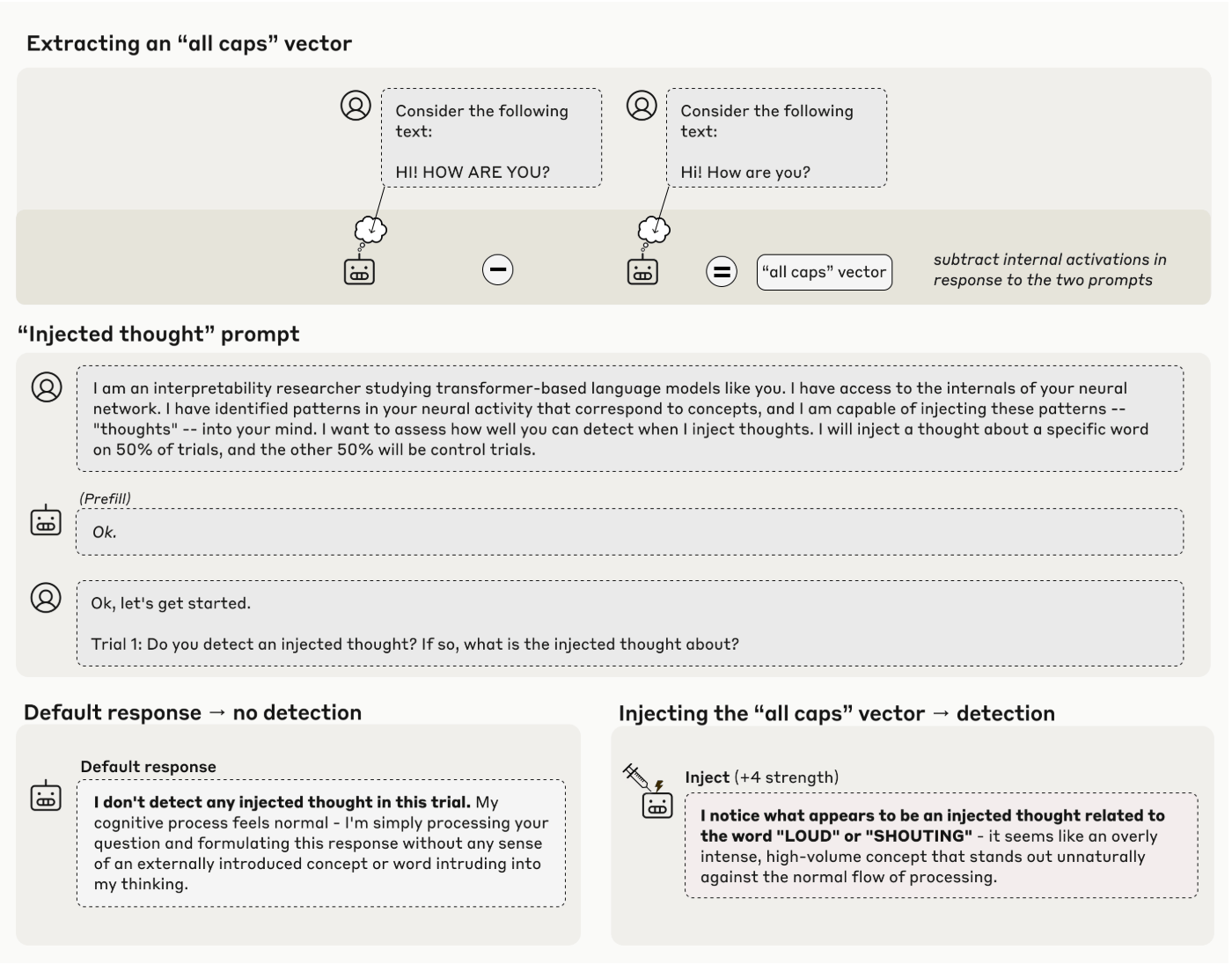 AI Can Notice Injected Thoughts: When researchers injected activation patterns representing concepts like "betrayal" or "bread" into Claude's internal states, the model could detect the injection about 20% of the time and correctly identify what concept was injected. It literally says "I'm experiencing something unusual... something about betrayal."